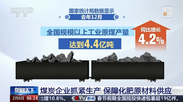 统计局数据显示,去年12月,全国规模以上工业原煤产量达到4.4亿吨,同比增长4.2%,2024年全年,规模以上工业原煤产量为47.6亿吨,同比增长1.3%。原煤产量创历史新高,为能源安全和化肥生产提供了有力保障。(央视新闻客户端)